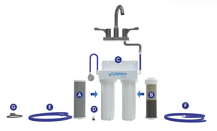 Installing the CellaVera™ Wellness System is a straightforward process that most homeowners can complete in under an hour with just basic tools. CellaVera™ requires only an adjustable wrench and a drill with a Phillips head bit—tools most households already have on hand. Also supplied is a tool to help remove or tighten the filter housings (G).